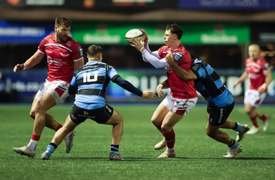 191225 - Cardiff Rugby v Scarlets, United Rugby Championship - Tom Rogers of Scarlets passes the ball out