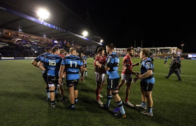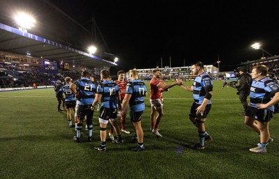 191225 - Cardiff Rugby v Scarlets, United Rugby Championship - Johnny Williams of Scarlets and Max Douglas of Scarlets at the end of the match