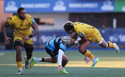 261225 - Cardiff Rugby v Dragons RFC - United Rugby Championship - Josh McNally of Cardiff Rugby is tackled by Levi Douglas of Dragons